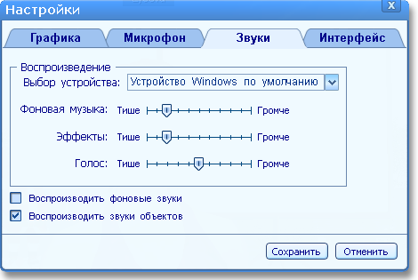 Отключить/включить воспросизведение фоновых звуков и звуков объектов, можно поставив соответствующие галочки.